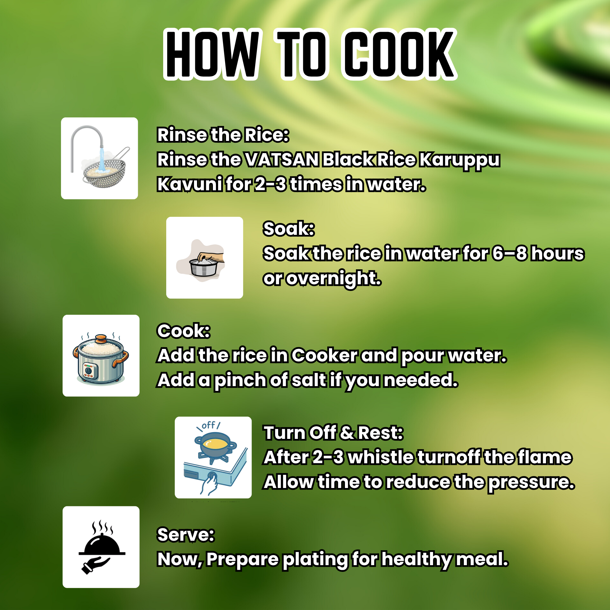 Karupu Kavuni Rice can be cooked like regular rice, but it is recommended to soak it for a few hours before cooking to soften the grains. The rice-to-water ratio is typically 1:2 or 1:3, and it can be cooked in a rice cooker or on the stovetop.